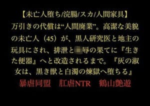 暴虐同盟【エロ漫画】【未亡人堕ち/浣腸/スカ/人間家具】万引きの代償は‘人間廃業’。高潔な美貌の未亡人(45)が、黒人研究医と地主の玩具にされ、排泄と陵●の果てに『生きた便器』へと改造されるまで。『灰の淑女は、黒き獣と白濁の煉獄へ堕ちる』/作:暴虐同盟